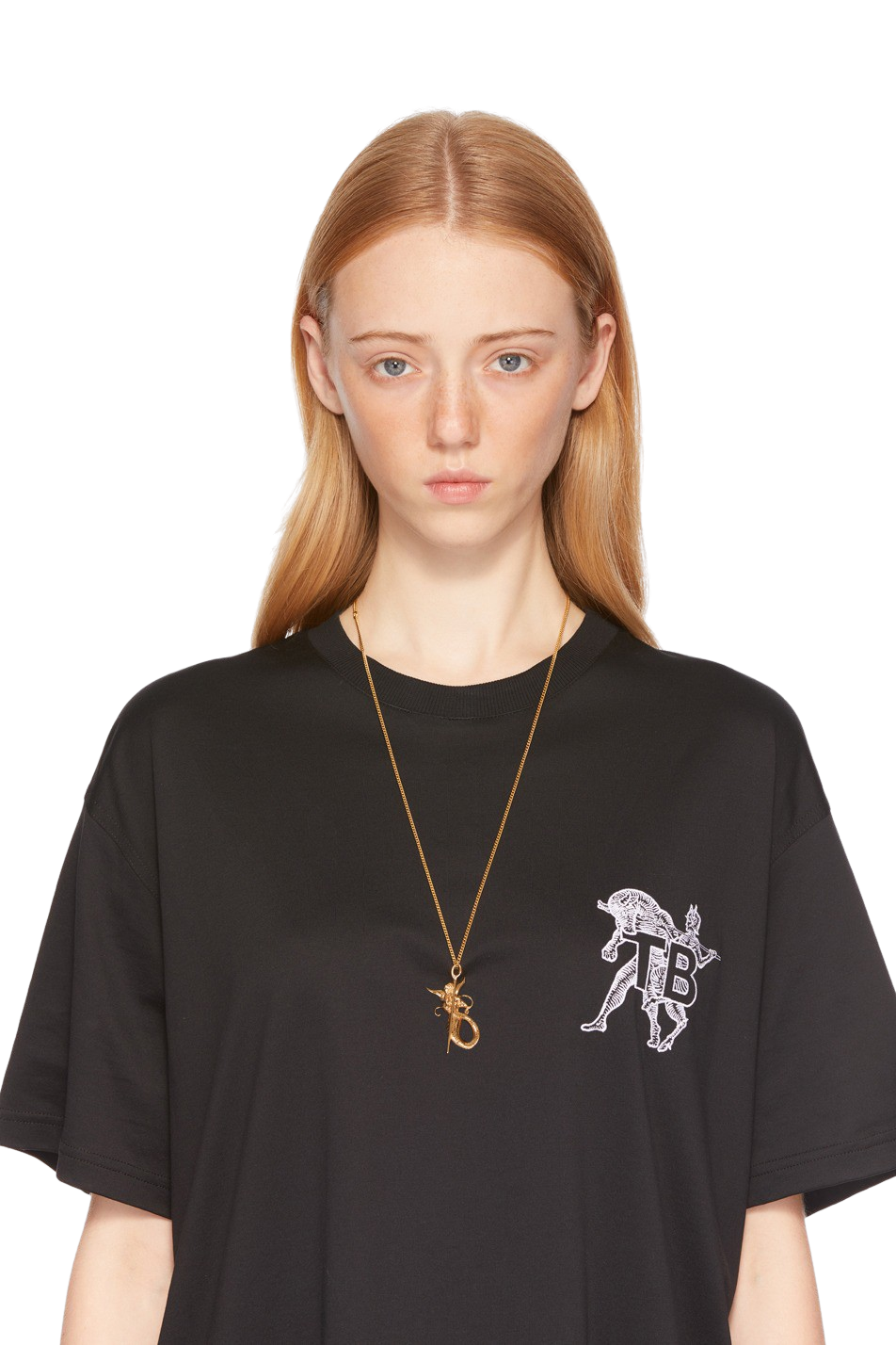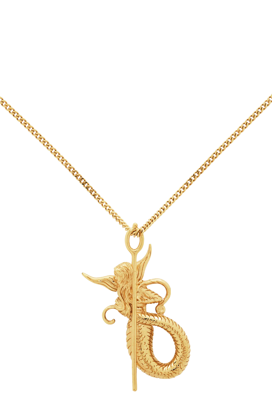 Curb chain necklace in gold-tone. Graphic pendant at drop. Logo engraved at back face. Logo plaque at adjustable spring-ring fastening. Approx. 25.5" full length.