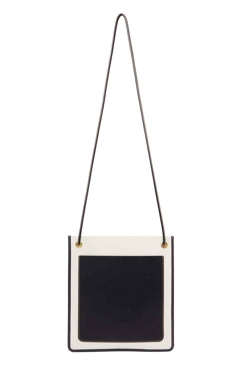 Canvas shoulder bag in white. Buffed leather trim in black with stitching in white throughout. Adjustable shoulder strap with self-tie fastening. Logo and graphic printed in black at face. Patch pocket at back face. Leather logo patch at interior. Tonal canvas lining. Logo-engraved gold-tone hardware. Approx. 8.25" length x 9" height.