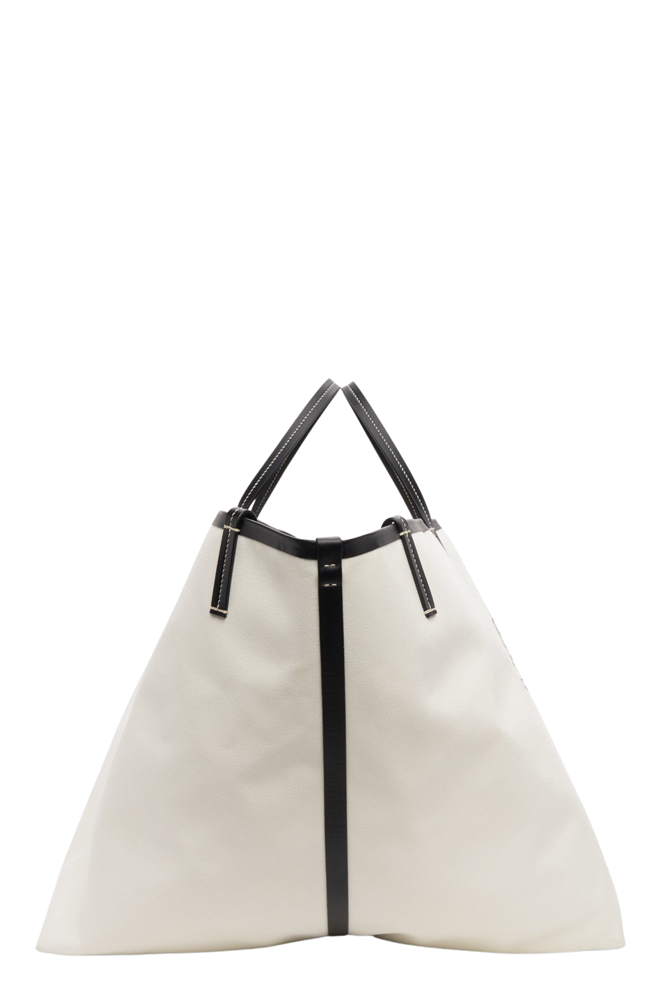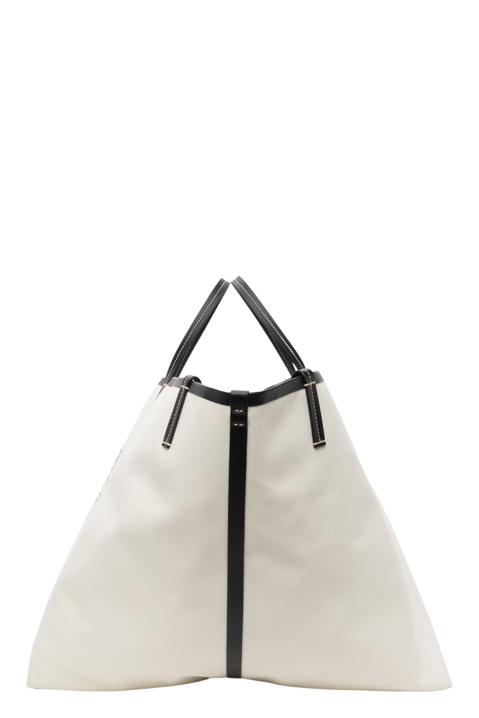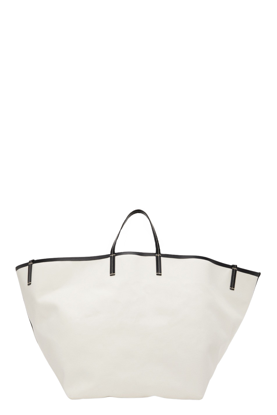 Canvas tote in white. Buffed leather trim in black featuring stitching in white throughout. Twin carry handles and twin shoulder straps at top. Logo and graphic printed in black at face. D-ring hardware and press-stud tab fastening at throat. Tonal detachable zippered pouch with post-stud fastening at interior. Unlined. Gold-tone hardware. Approx. 17.5" length x 14" height x 14" width.