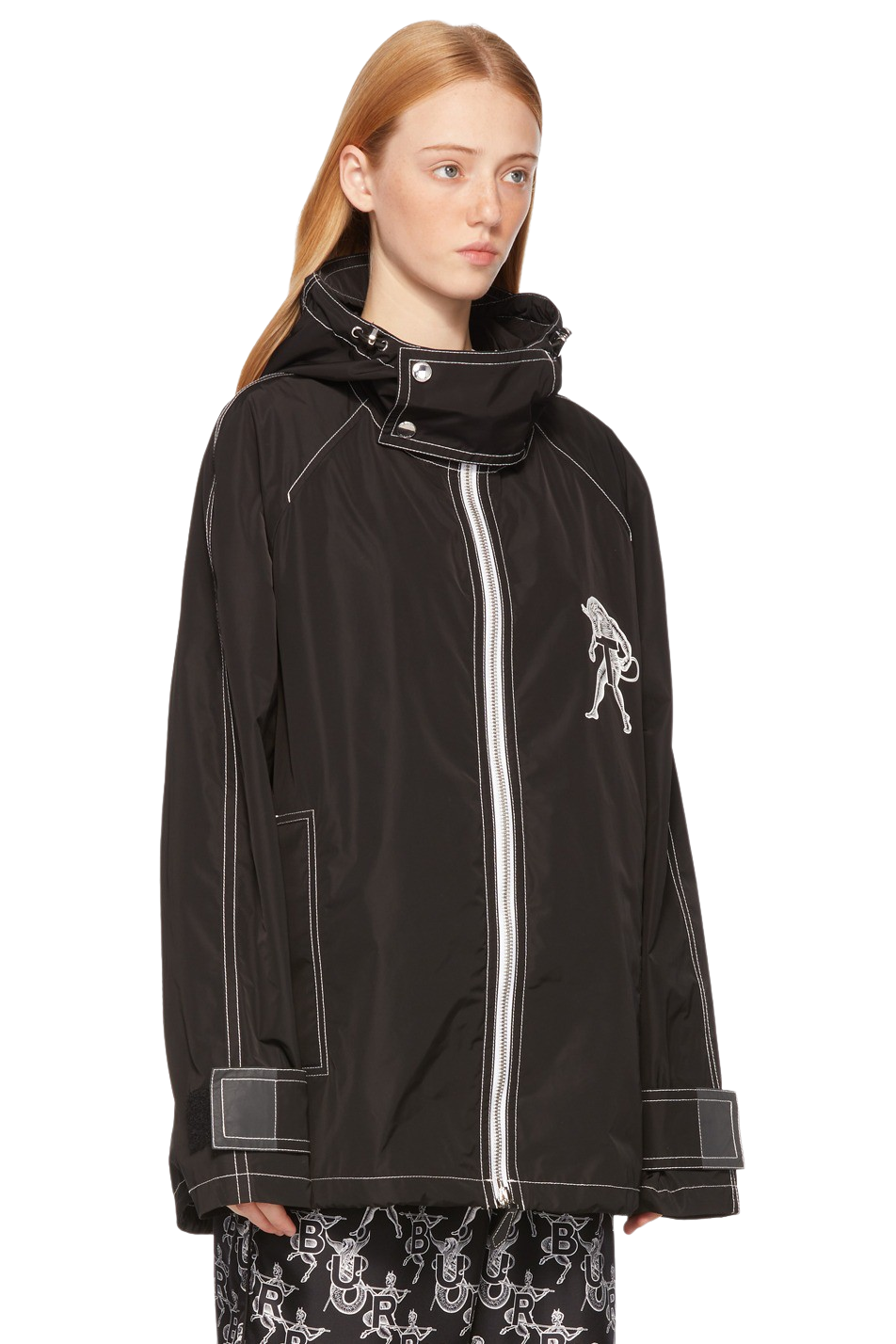 Long sleeve taffeta jacket in black. Bungee-style drawstring at brimmed hood. Detachable throat guard with press-stud fastening at stand collar. Two-way zip closure at front. Logo graphic printed in white at chest and back. Welt pockets at waist. Raglan sleeves. Adjustable Velcro strap at cuffs. Reflective black trim at cuffs and back hood. Concealed bungee-style drawstring at hem. Zippered pocket at interior. Fully lined. Logo-engraved silver-tone hardware. Contrast stitching in white. Part of the Burberry x K-Way collaboration.