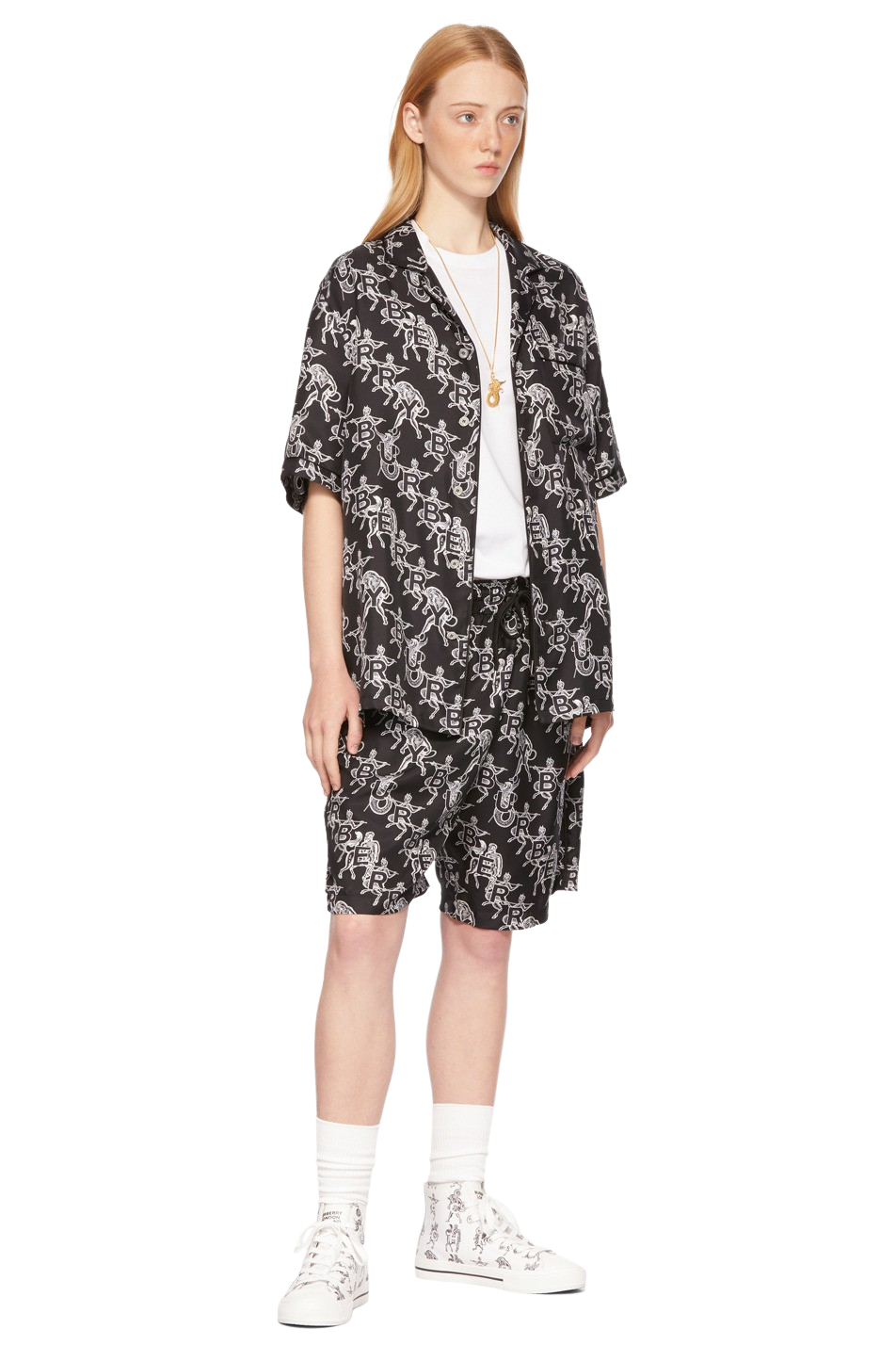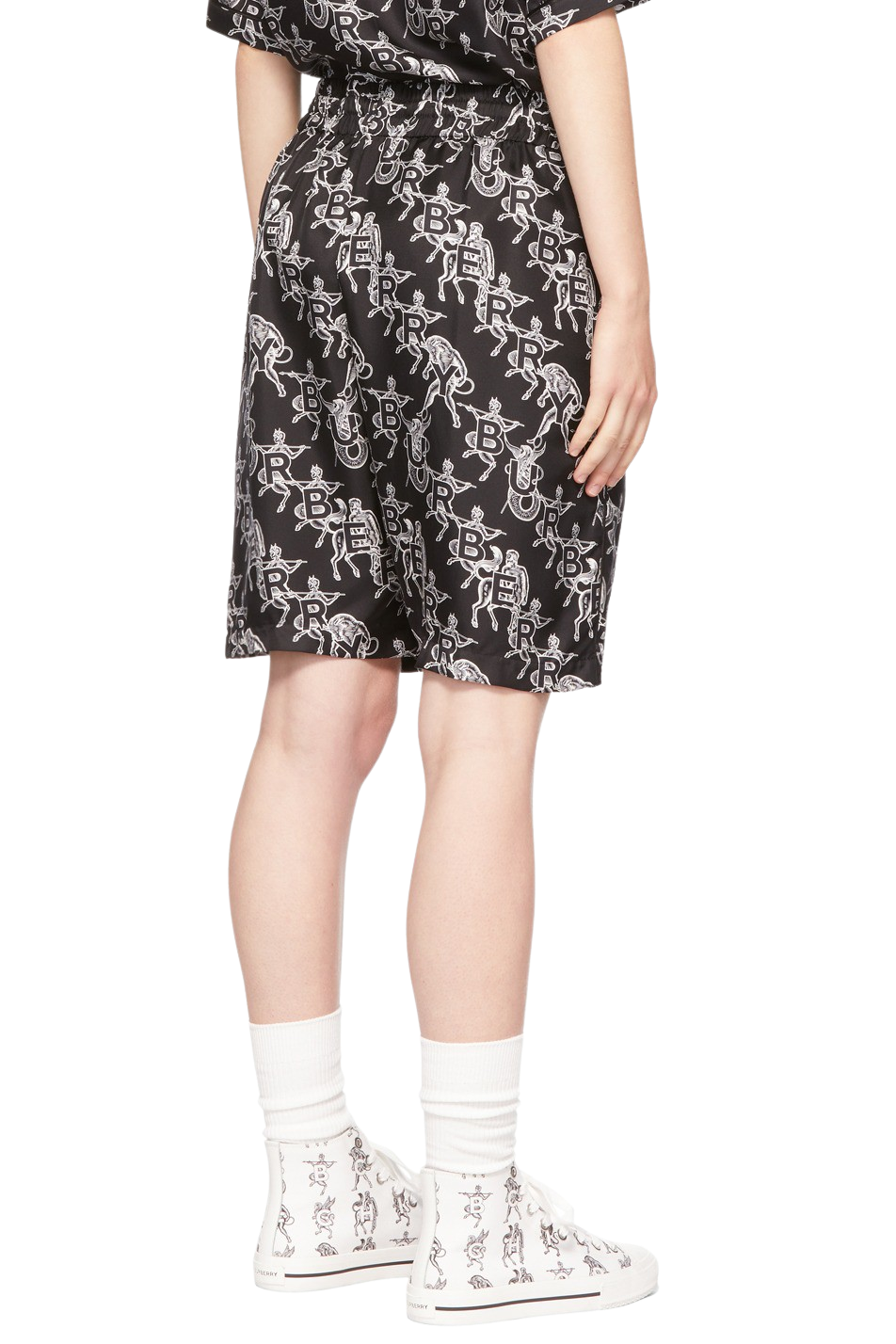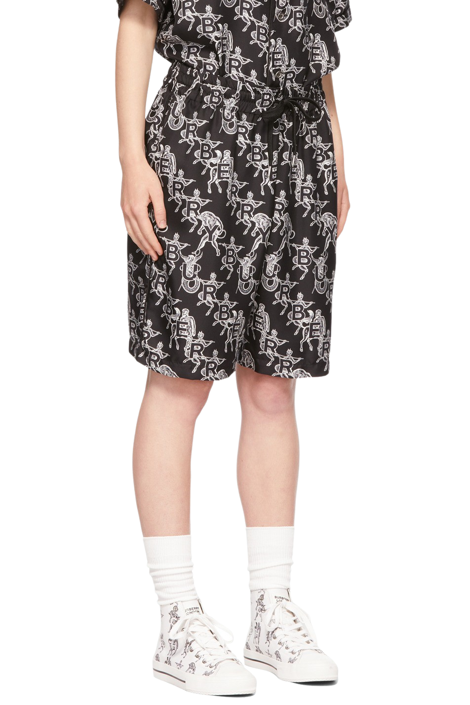Silk twill shorts in black featuring logo pattern in white. Mid-rise. Tonal piping throughout. Two-pocket styling. Drawstring at elasticized waistband.