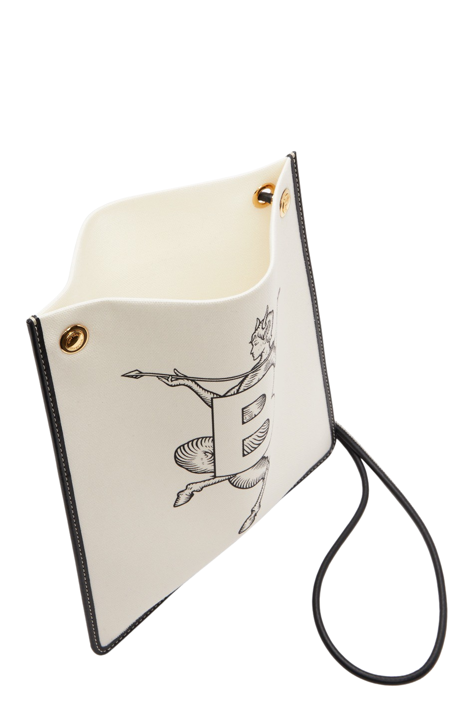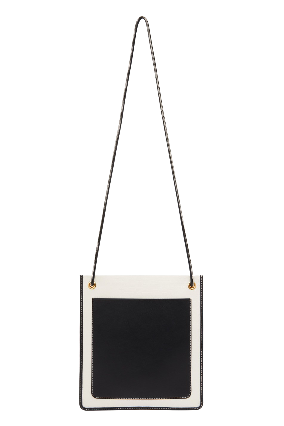 Canvas shoulder bag in white. Buffed leather trim in black with stitching in white throughout. Adjustable shoulder strap with self-tie fastening. Logo and graphic printed in black at face. Patch pocket at back face. Leather logo patch at interior. Tonal canvas lining. Logo-engraved gold-tone hardware. Approx. 8.25" length x 9" height.