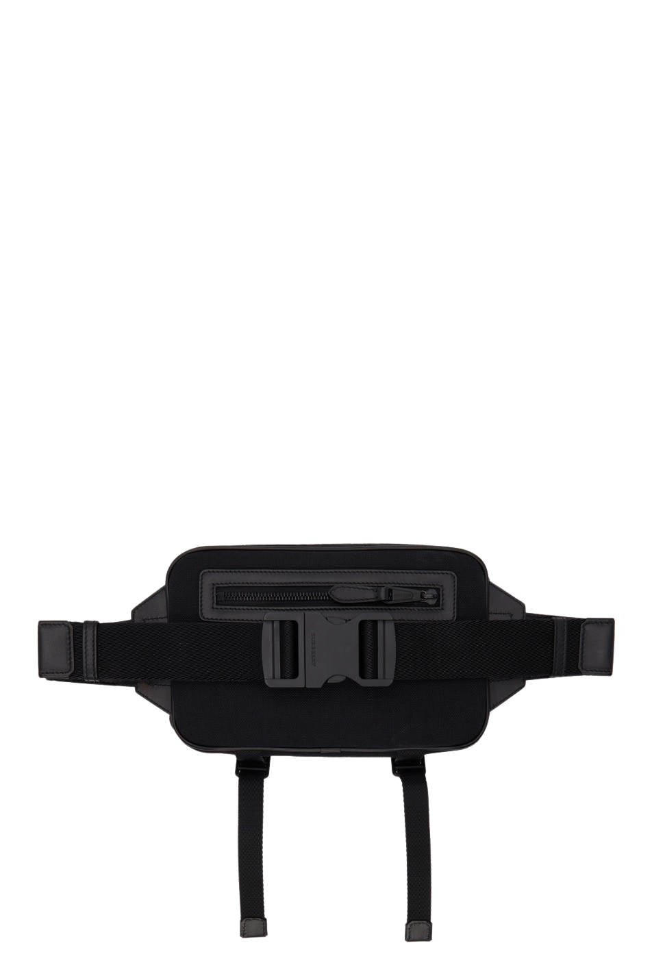 Canvas pouch in black. Tonal leather trim throughout. Adjustable webbing belt-style strap with press release fastening. Logo and graphic printed in white at face. Zippered pocket at back face. Cinch straps at base. Zip closure. Patch pocket with silver-tone logo stamp at interior. Tonal satin lining. Tonal logo-engraved hardware. Approx. 8" length x 5" height x 2.25" width.