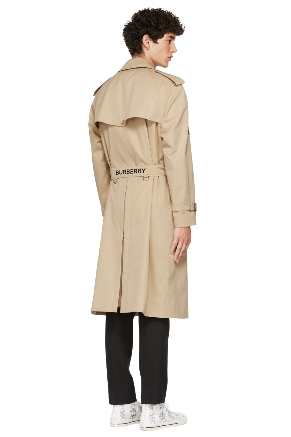 Long sleeve cotton twill trench coat in beige. Hook-eye fastening at spread collar. Double-breasted button closure at front. Storm flap with button fastening at chest and back yoke. Logo and graphic embroidered in black at front. Belt loops, detachable belt with pin-buckle fastening, and welt pockets with button fastening at waist. Buttoned epaulets. Raglan sleeves. Adjustable strap with pin-buckle fastening at cuffs. Central vent at back hem. Fully lined. Tortoiseshell and gold-tone hardware. Part of the Burberry Mythical Alphabet capsule collection. Available exclusively at SSENSE.