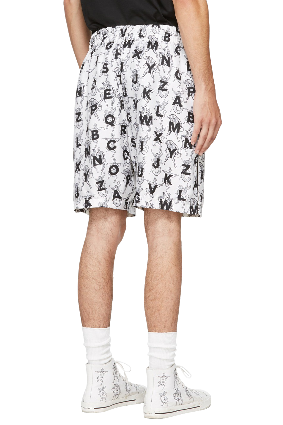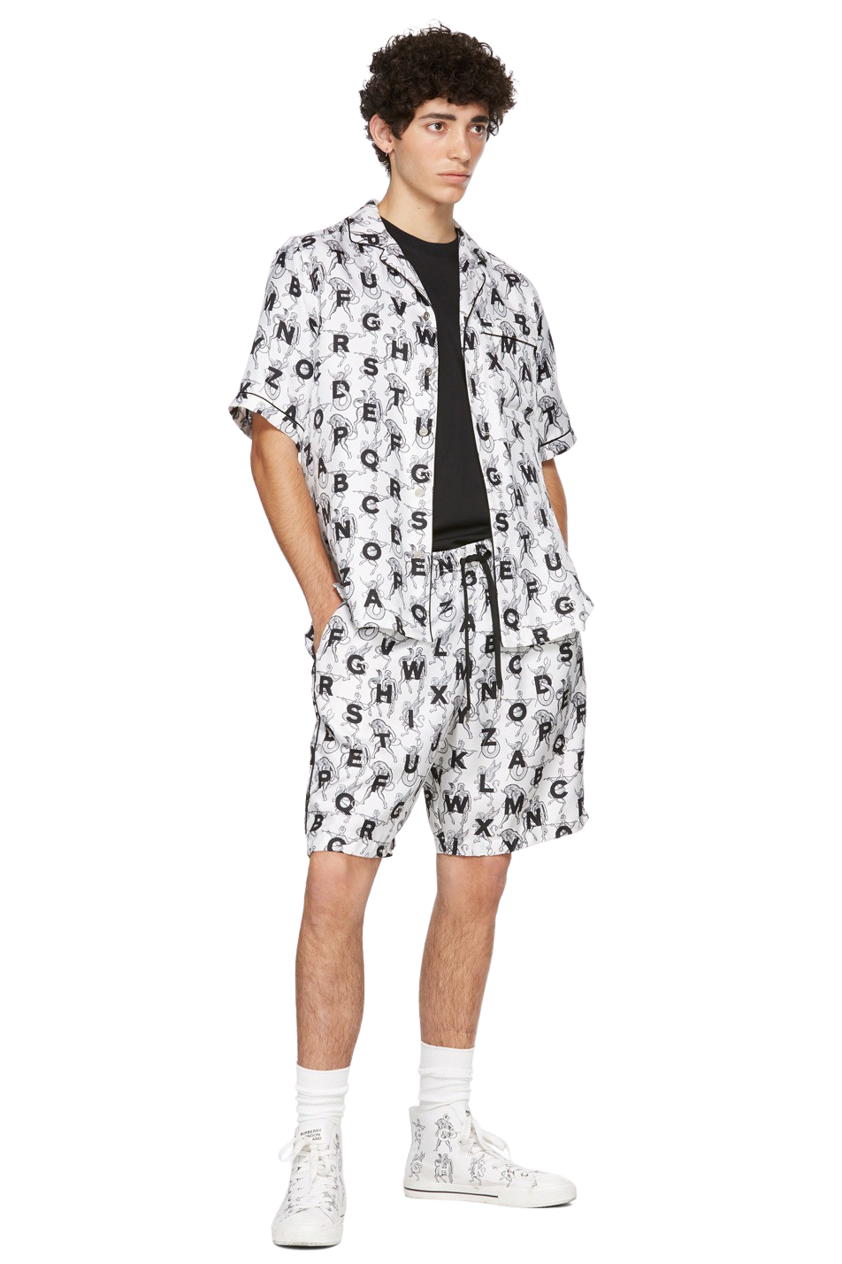 Silk twill shorts in white featuring graphic pattern in black. Mid-rise. Piping in black throughout. Two-pocket styling. Drawstring at elasticized waistband.
